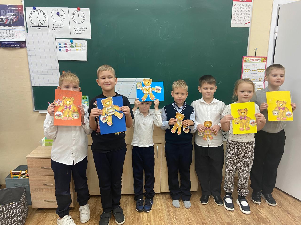 Ребята 1"В" класса сделали бумажную аппликацию "Мишка-сладкоежка".