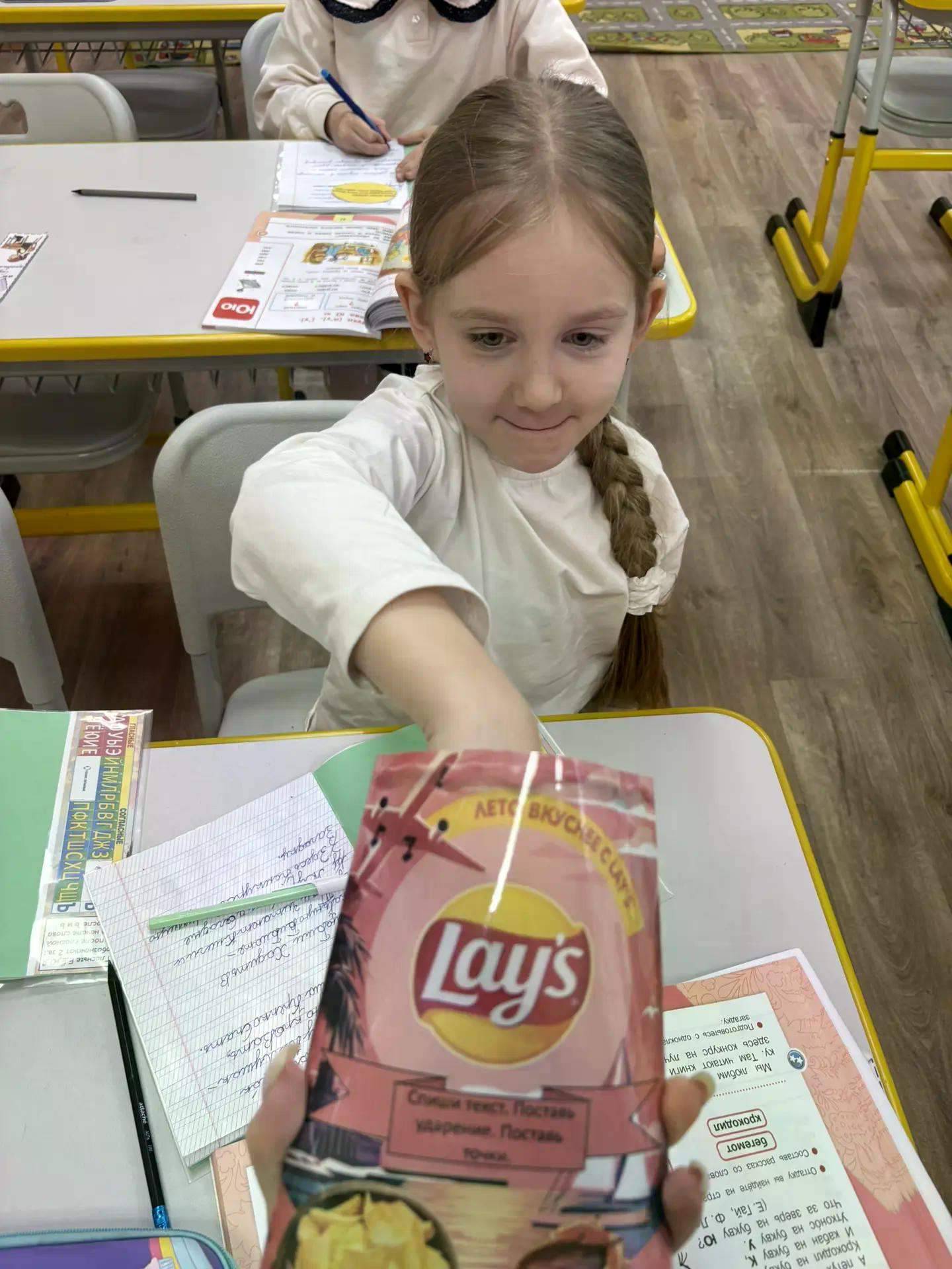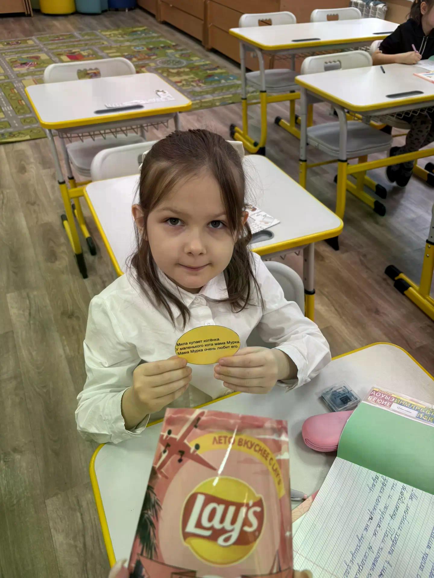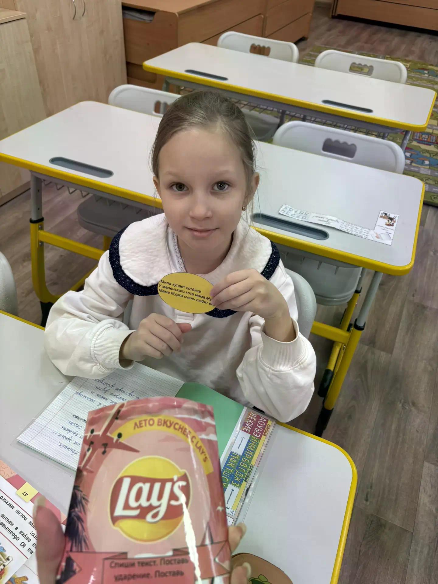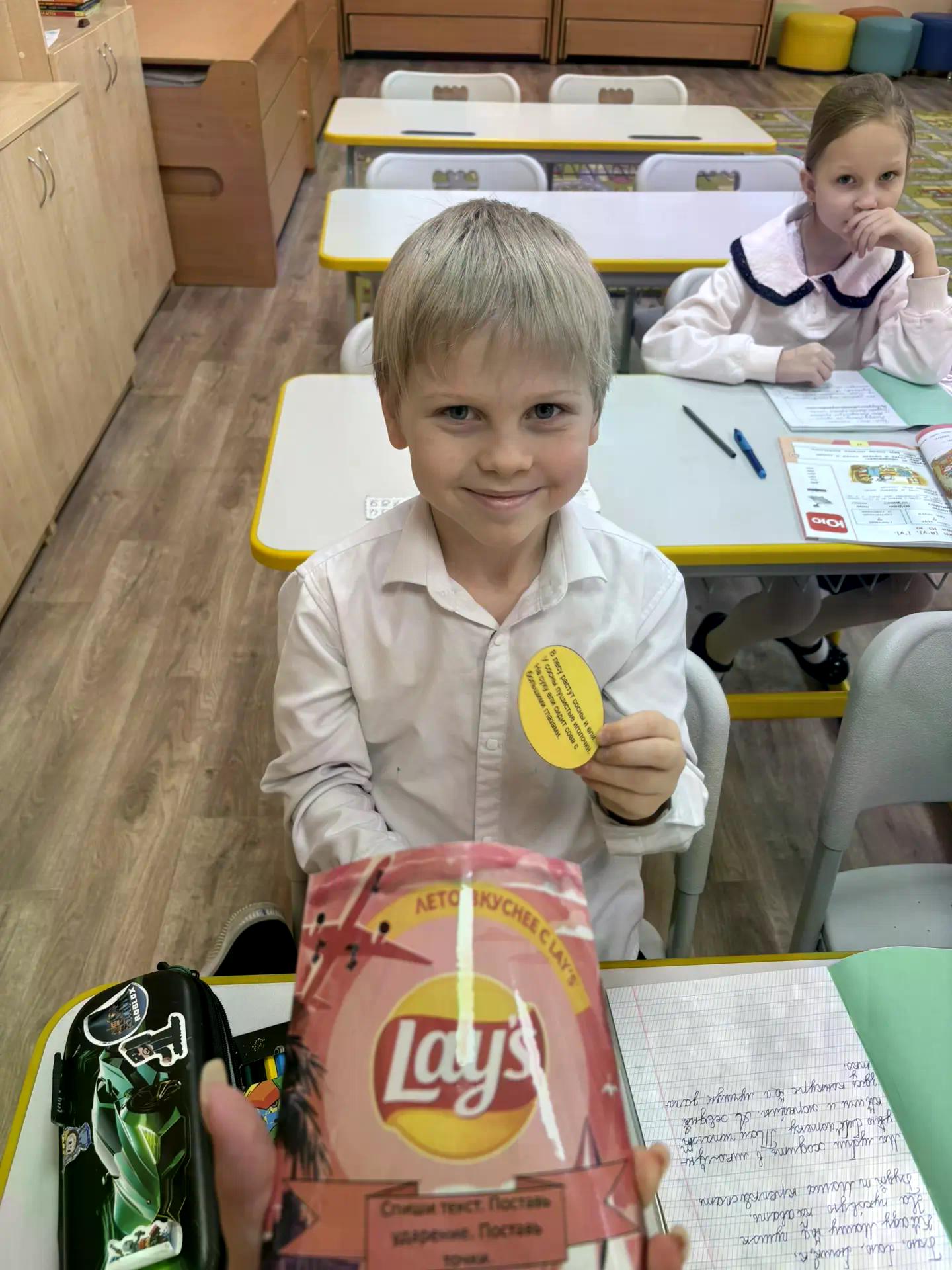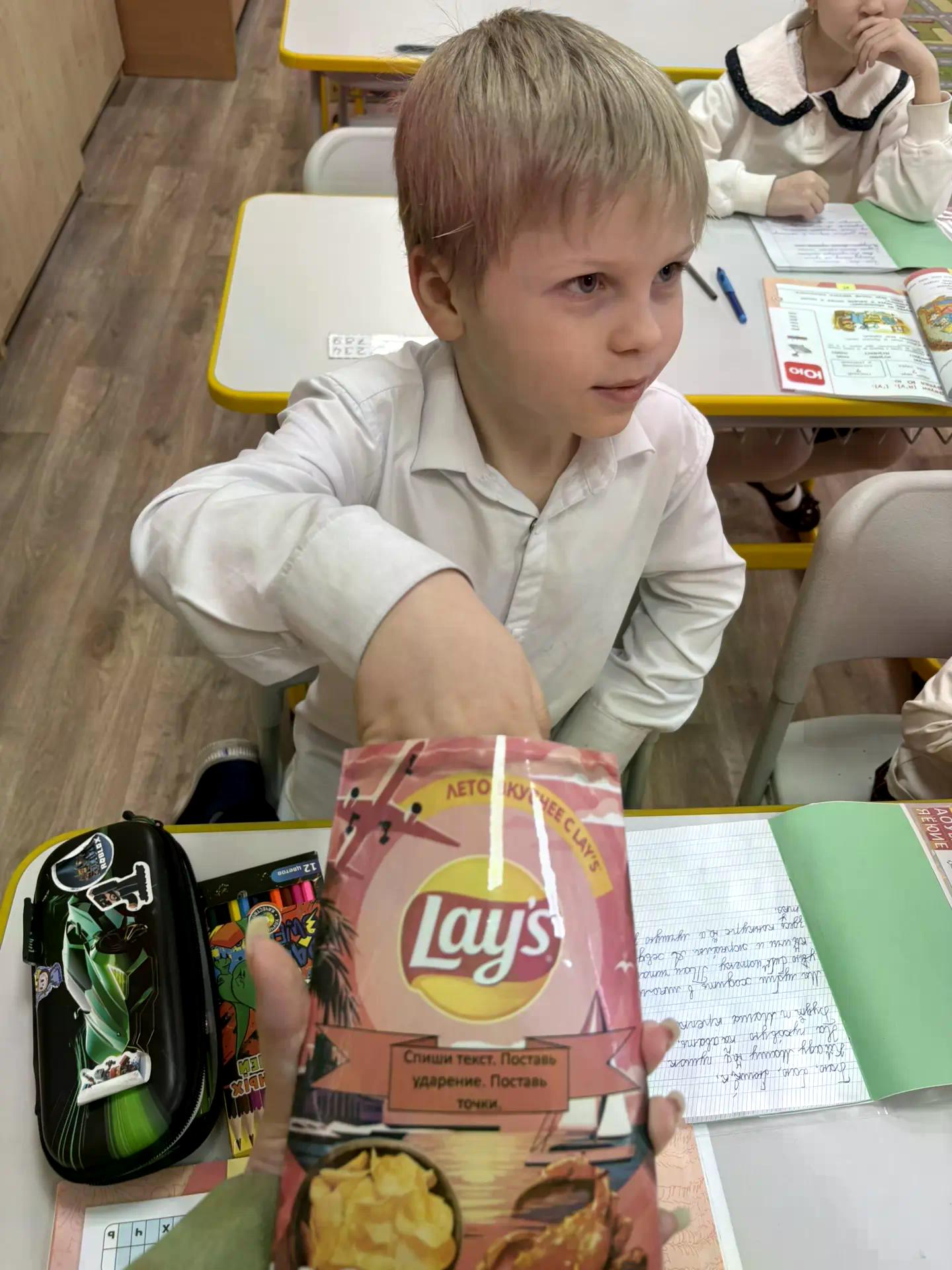 Сегодня на уроке письма ученики 1"Б" класса открыли пачку чипсов, но не простую, а с заданиями.