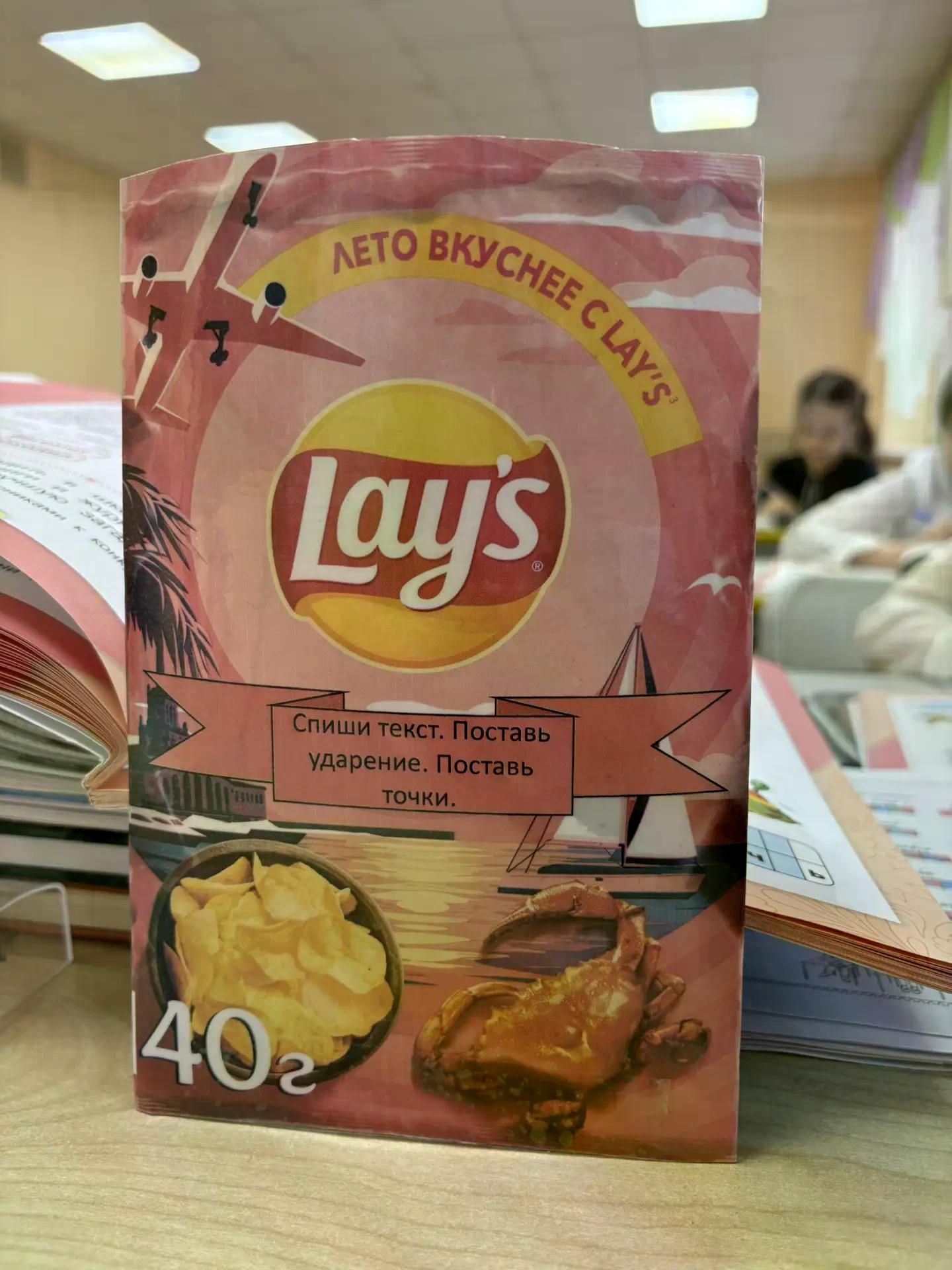 Ученикам необходимо было взять себе чипсинку и списать с неё текст в тетрадь.